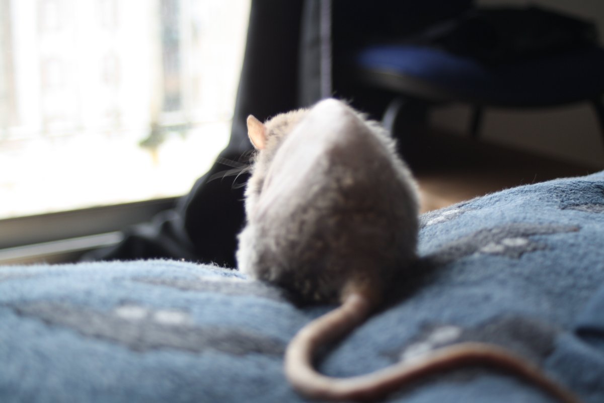 A la maison, Scarlett est une ratoune incroyable. ^^ Super proche de l'humain, joueuse, et complètement hyperactive ! Dès que je passe devant la cage, elle est accrochée aux barreaux, et si j'ai le malheur de m'approcher, elle mord les barreaux et elle saute partout pour que je la fasse sortir. Résultat, elle passe beaucoup de temps à se promener parce que je peux pas résister xD