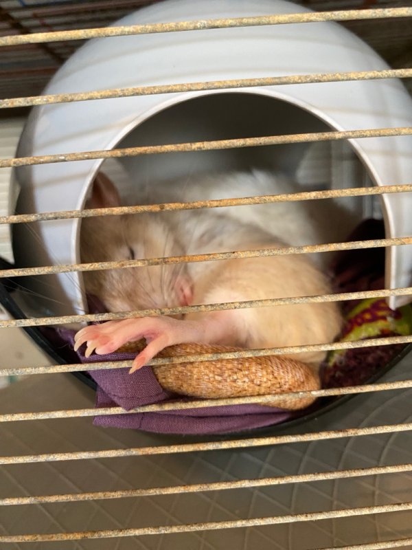 Elle a perdu du poids car je sens ses os quand je la papouille et j’ai aussi choisi de ne pas la faire réopérer et d’aménager la cage pour qu’elle puisse monter dans les étages sans trop galéré