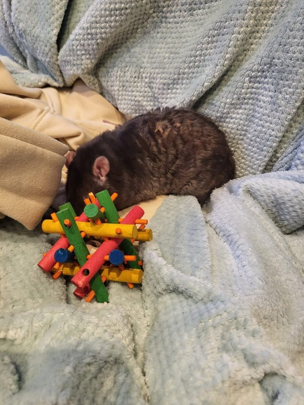 Comportement avec les autres rats : Il est clairement le dominant, mais reste toujours dans le jeu avec Pocus. Il adore se blottir contre son frère pour dormir.