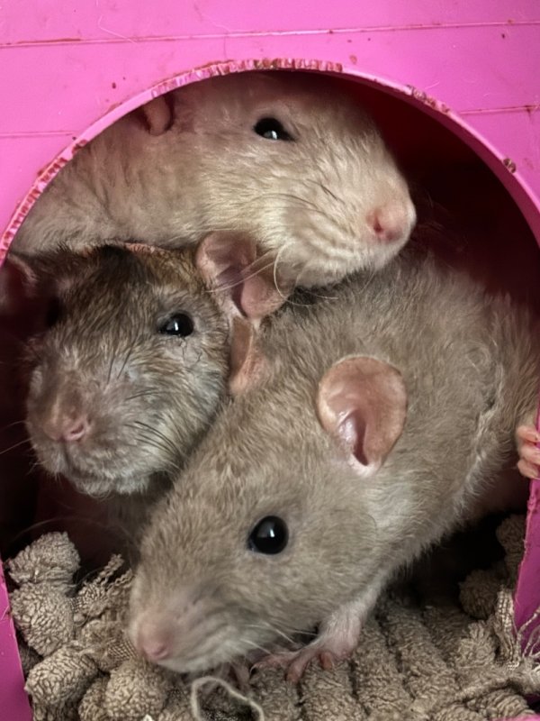 Les petites princesses ont parfaitement intégrées la tribu. Un peu malmenées par la très belle mais très chiante Here I Am pour ne pas la citer elles ne se laissent pas faire. Elles font leurs vies de rates en liberté et ont très vite compris qu’elles pouvaient aller partout dans la pièce. Déshonneur dort pas mal avec les copines Ohana est plus solitaire dans le dodo. Elles adorent me grimper dessus et se planquer dans mes poches.