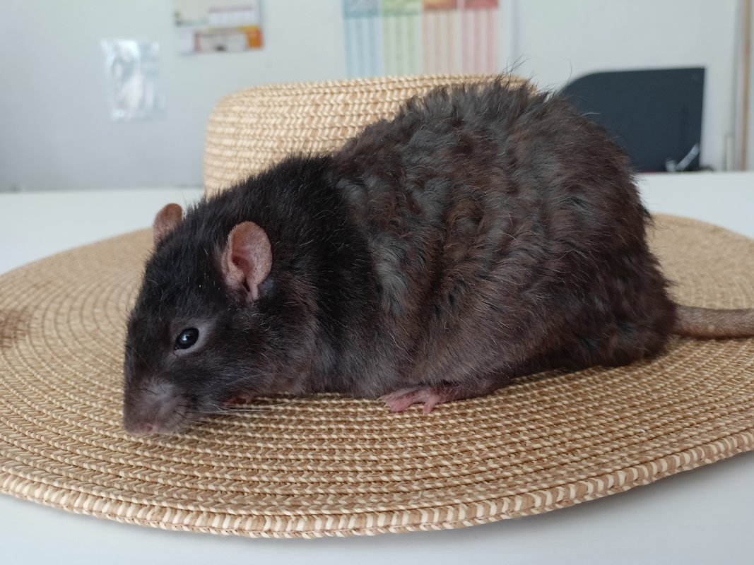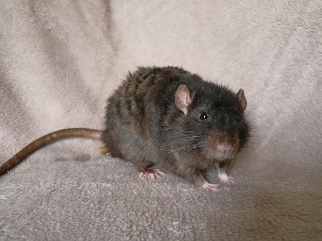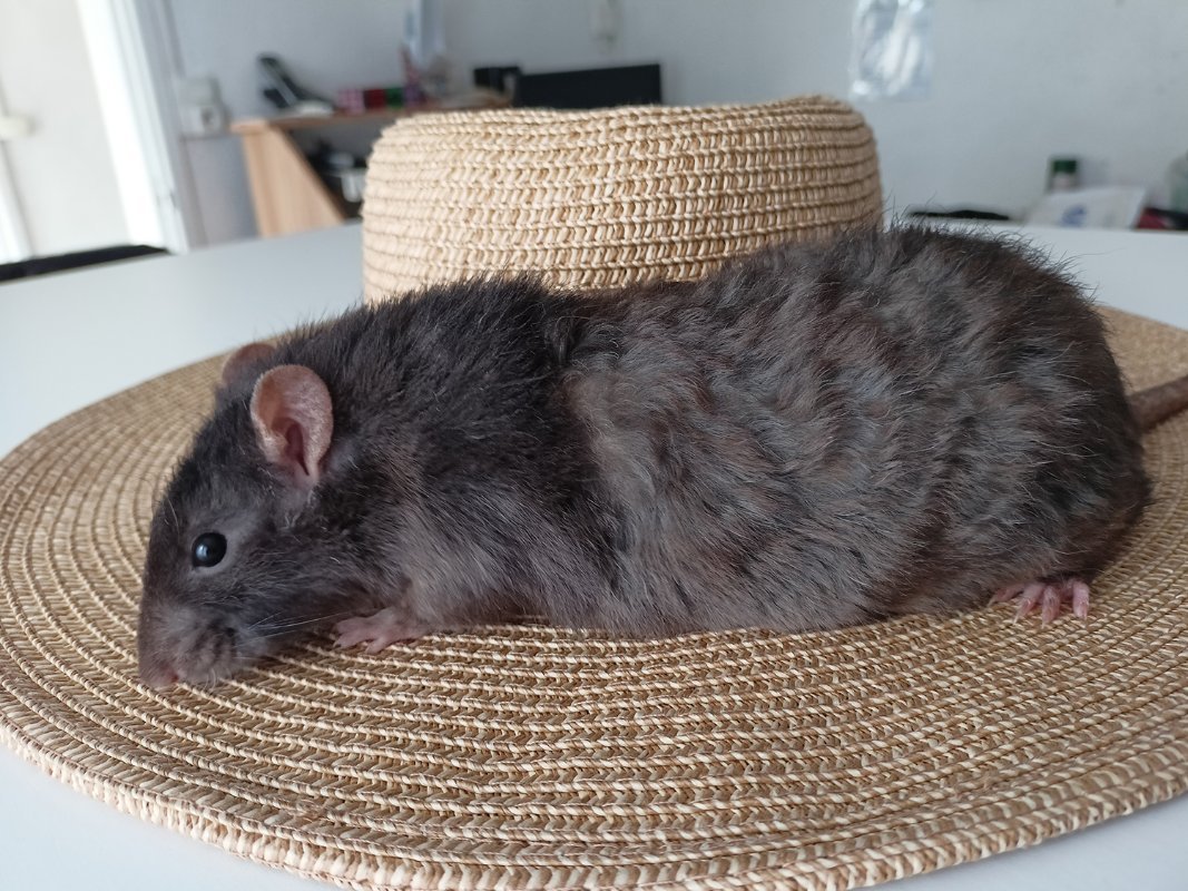 ARK-ONI Monsoon, née le 27 Mai 2022 à la maison, en collaboration avec @Etoile. Noire unie standard rex. Une ratoune assez timide, tendance flipette, mais gentille comme tout. Plutot neutre à dominée avec les autres rats, s'entend avec tout le monde. Sa généalogie sur le LORD. Sa fiche sur mon site.