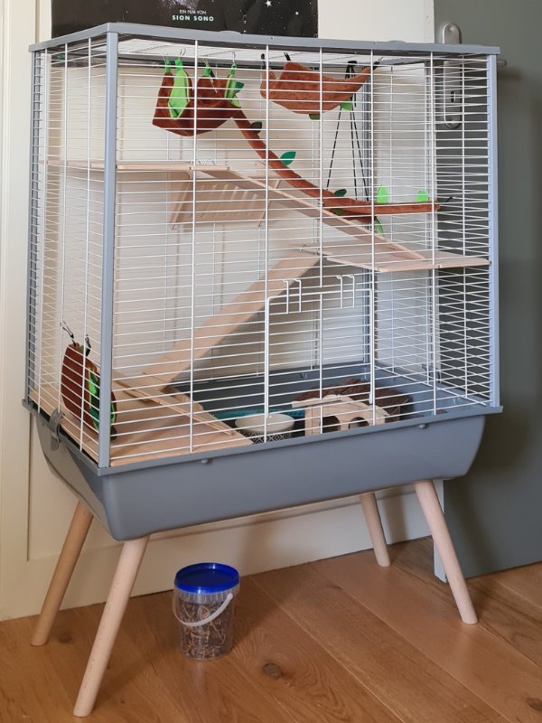 Nous avons acheté a une particulière sa cage et tous les accessoires/nourritures/litière/jeux. C'est une grande cage neo sur pied (voir la photo)