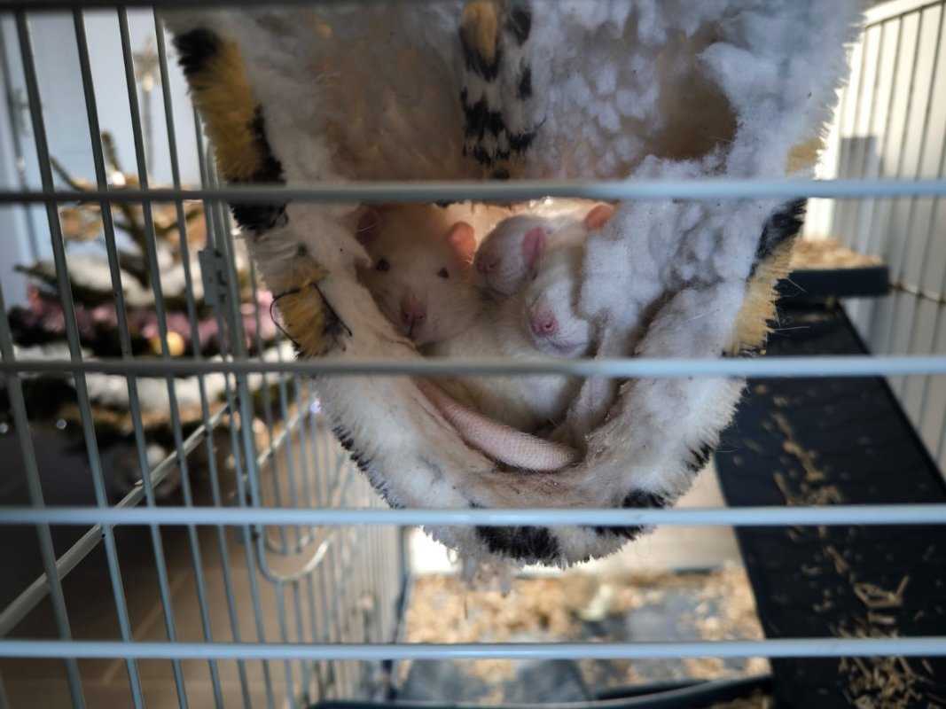 Les 4 rats s'entendent très bien et mangent et dorment en groupe. Ils ne sont pas dérangés par le chien qui vit au sein du foyer de leur famille d'accueil et l'ignorent.
