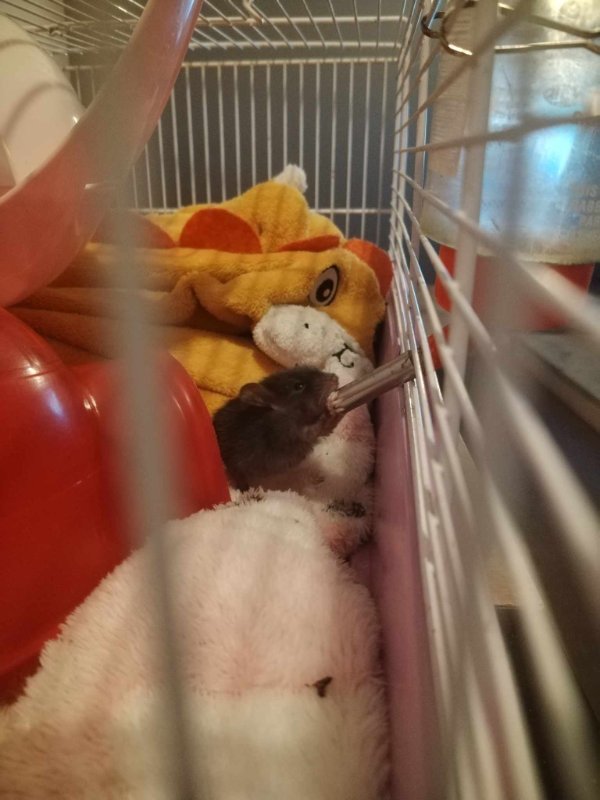 De décide donc de la placer dans une plus grande cage, prenant une de mes cage de maternité, je me rend compte qu'elle est si petit qu'elle passe a travers les barreaux et honnêtement c'est beaucoup trop grand pour elle, que le biberon est trop haut, bref rien ne va.