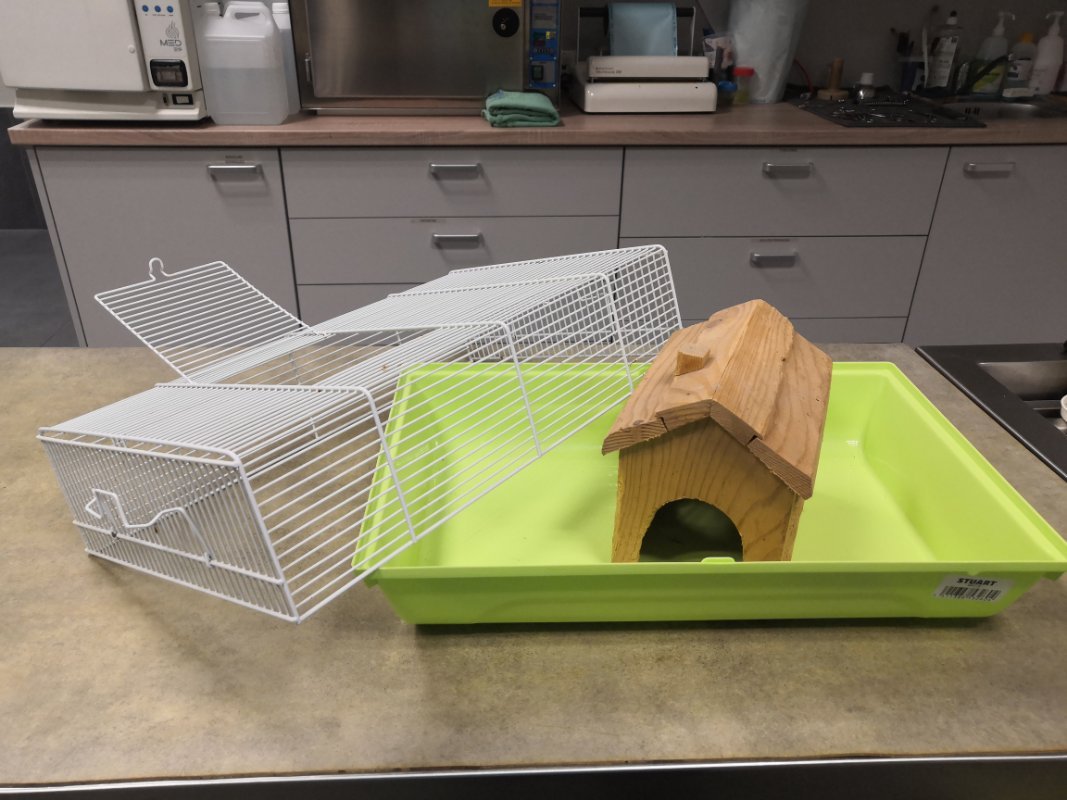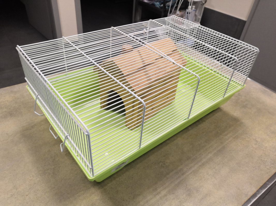 La clinique vétérinaire où je travaille a reçu d'un client une cage "à hamster" mais n'en a pas l'utilité, nous la proposons donc en don à venir récupérer à Obernai (67). Elle mesure 45 x 28 x 19 cm et est accompagnée d'une maisonnette en bois. Elle peut éventuellement servir de cage de convalescence très temporaire pour de petits rongeurs, voire de cage de transport.