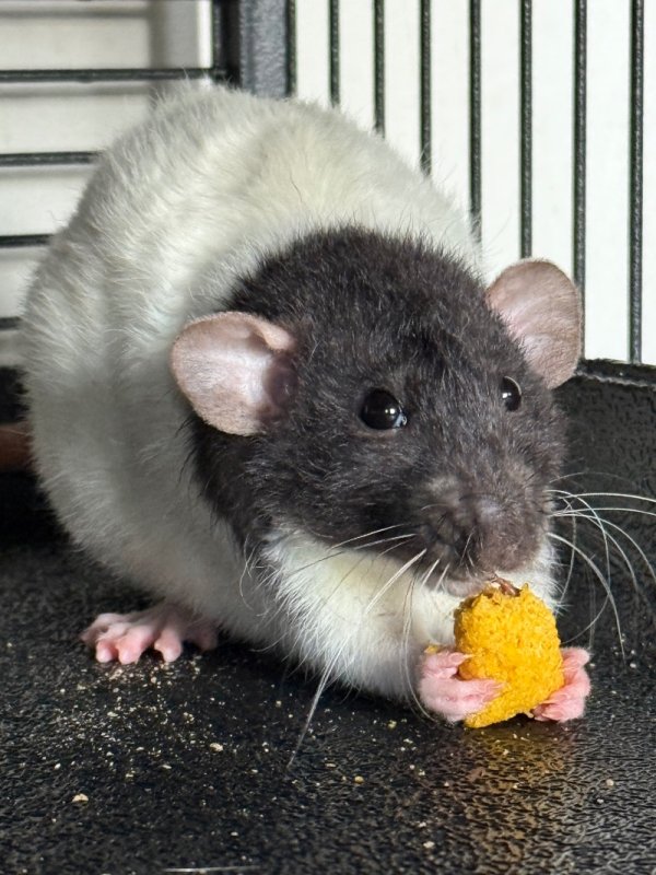 Caractère avec les copains : son intégration s'est bien passé avec les adultes, comme sa soeur, il est arrivé juste après d'autres intégrations de ratons donc les mâles ont été rapidement accueillants avec lui. Il est gentil avec tout le monde et écrabouille moins les plus plus petits que lui que sa soeur !
