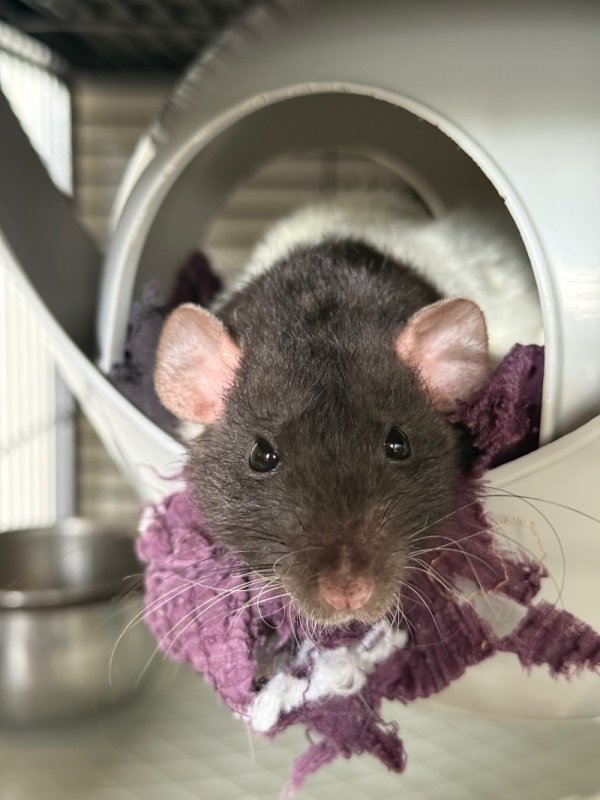 Il est un peu plus souvent seul que les autres, mais il adore les papouilles — surtout dans sa cage. Il s’entend très bien avec ses frères. Lui aussi se laisse facilement attraper, même si avoir les pieds dans le vide, ce n’est pas trop son délire.