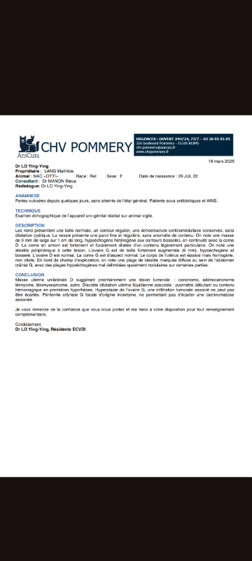 Je n'arrive pas trop à lire le CR vu qu'il est en très basse résolution, mais j'ai l'impression qu'on parle plutôt d'une tumeur ovarienne avec possiblement de la carcinose péritonéale et LÀ c'est très différent, car une exérèse chirurgicale ne "guérirait" pas car elle ne pourrait pas être complète. C'est plutôt de ça dont je discuterai avec le vétérinaire, car une tumeur métastatique, opérer n'apporterait pas forcément grand chose :/
