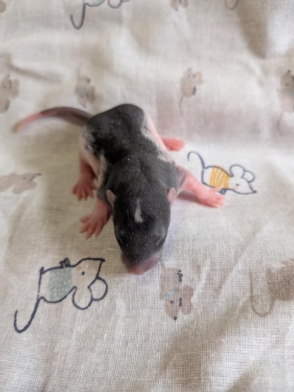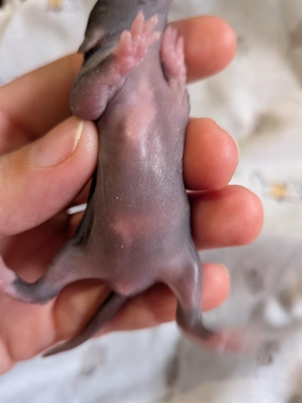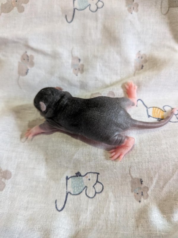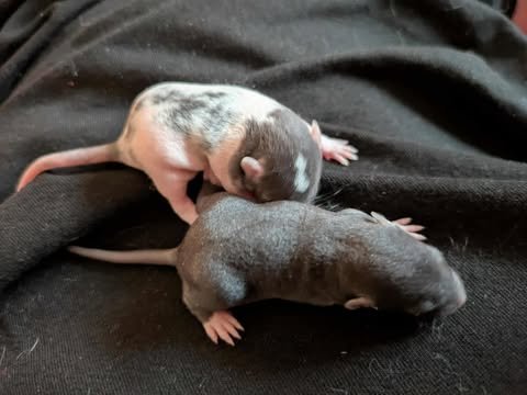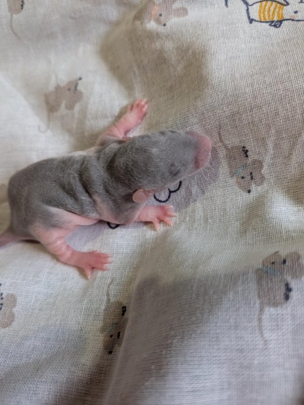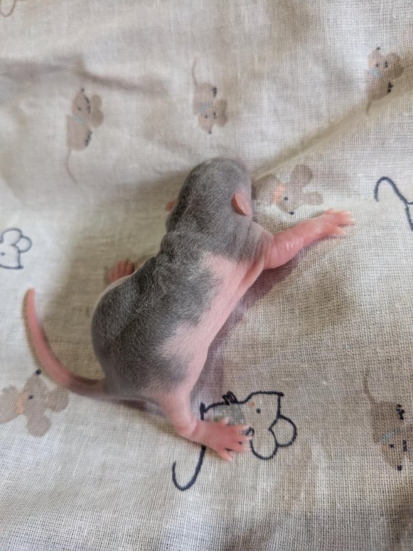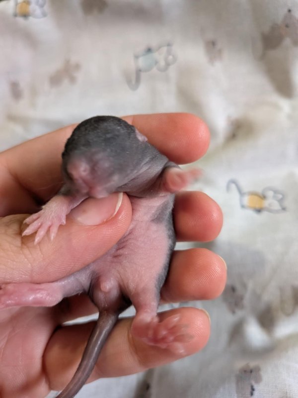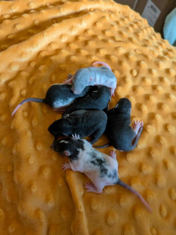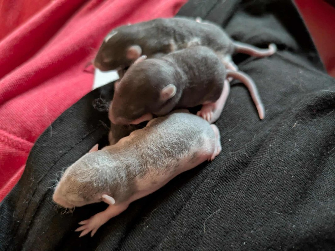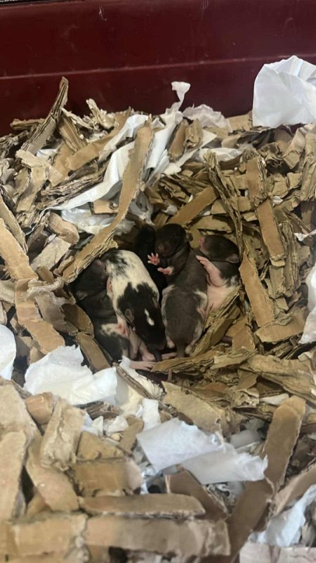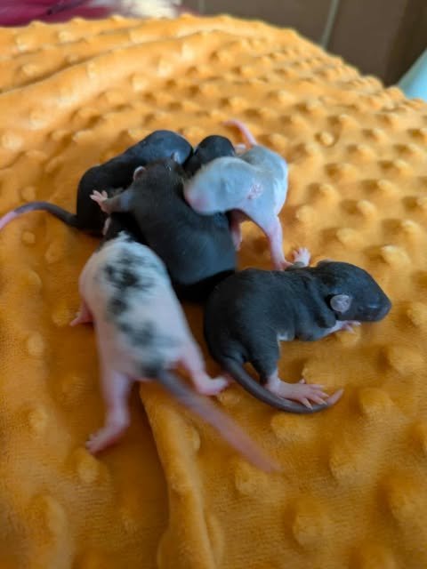 La mise bas a débuté le 11/07/2025 vers 12h15, durant J23. Le premier raton est né vers 12h30, le deuxième à suivi assez vite. Cependant le 3ème à eu du mal à sortir (mauvaise position, blocage?), et quand il est né après un certain temps, la maman l’a directement jeté du nid, c’était un raton mort né ;  le 4 ème qui a suivi très très rapidement également mort-né, qu’Aphrodite a écarté tout de suite du nid. Le 5ème était bien vif et est sorti facilement. Et là j’ai du malheureusement quitter la mise bas, étant donné que j’étais déjà en retard pour le travail. J’ai surveillé toute l‘après-midi via la caméra, tandis que mon conjoint est resté avec Aphrodite pour me donner plus de nouvelles. Finalement,  3 autres lardons sont arrivés dans la famille. Aphrodite à été parfaite, bidon souple à mon retour le soir, plus de saignement. Pour vous dire elle me fait tellement confiance que je peux manipuler ses bébés avec elle sur le côté, sans qu’elle essaye de me mordre ou de les protéger. Merci Lenny car peu de saillies mais un bon petit nombre de bébés et une parité totale.