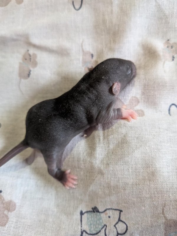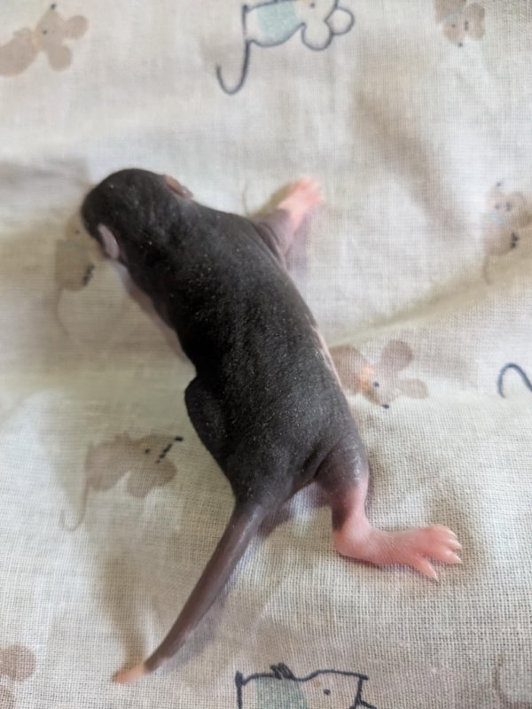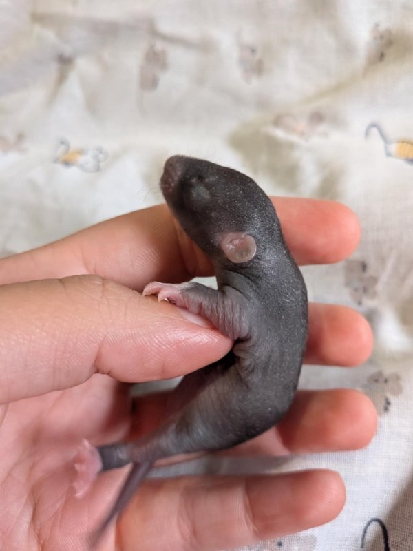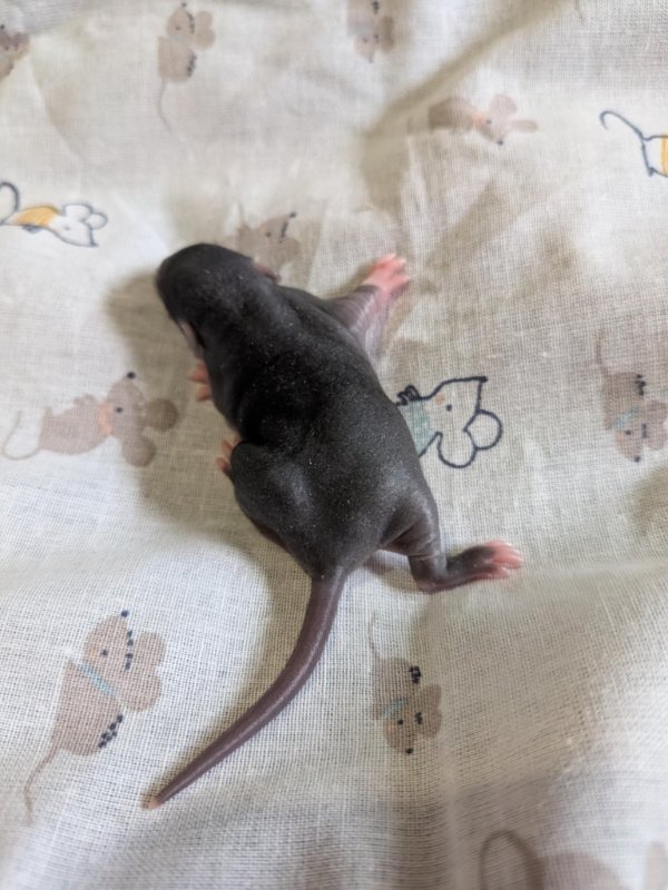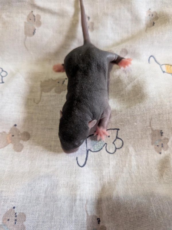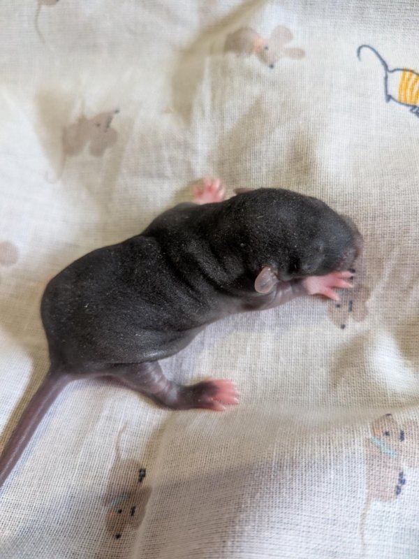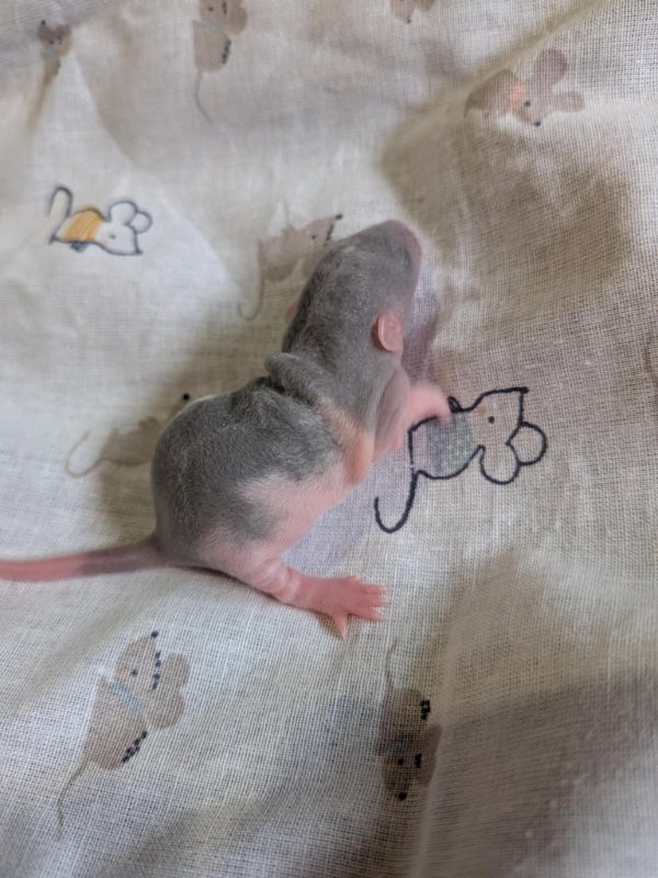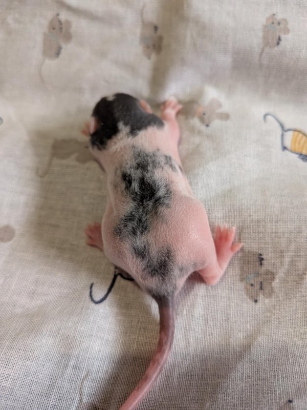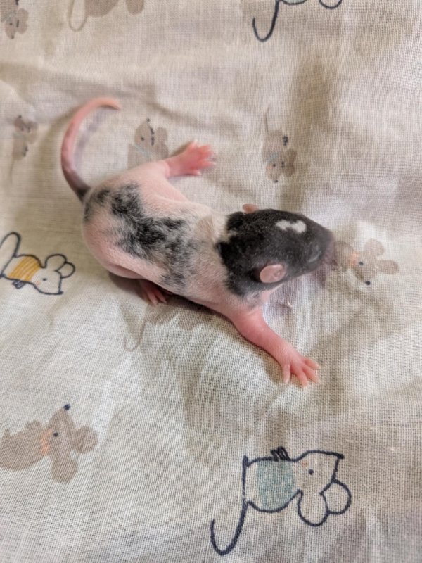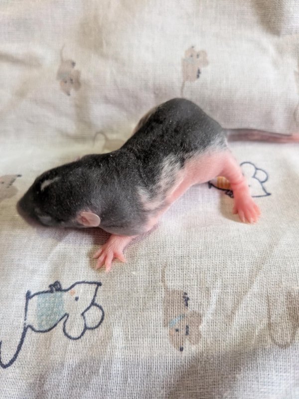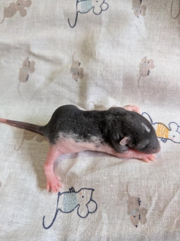 La mise bas a débuté le 11/07/2025 vers 12h15, durant J23. Le premier raton est né vers 12h30, le deuxième à suivi assez vite. Cependant le 3ème à eu du mal à sortir (mauvaise position, blocage?), et quand il est né après un certain temps, la maman l’a directement jeté du nid, c’était un raton mort né ;  le 4 ème qui a suivi très très rapidement également mort-né, qu’Aphrodite a écarté tout de suite du nid. Le 5ème était bien vif et est sorti facilement. Et là j’ai du malheureusement quitter la mise bas, étant donné que j’étais déjà en retard pour le travail. J’ai surveillé toute l‘après-midi via la caméra, tandis que mon conjoint est resté avec Aphrodite pour me donner plus de nouvelles. Finalement,  3 autres lardons sont arrivés dans la famille. Aphrodite à été parfaite, bidon souple à mon retour le soir, plus de saignement. Pour vous dire elle me fait tellement confiance que je peux manipuler ses bébés avec elle sur le côté, sans qu’elle essaye de me mordre ou de les protéger. Merci Lenny car peu de saillies mais un bon petit nombre de bébés et une parité totale.