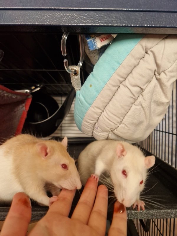 Je continue mon chemin avec mes ratounes d’amour. Aujourd’hui, elles sont sorties ce matin puis ce soir. Anna a été très active, grimpait sur moi. Elle a été très sympa en sortie, je pense que je vais juste limiter les interactions dans la cage, car c’est là qu’elle m’attaque.
