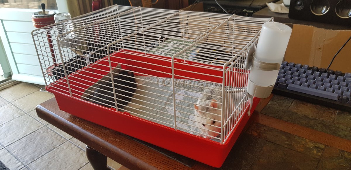 Actuellement ils sont toujours dans la petite cage avec des tissus que j'ai ajouté,  et ils dorment à côté,  ce qui est super!