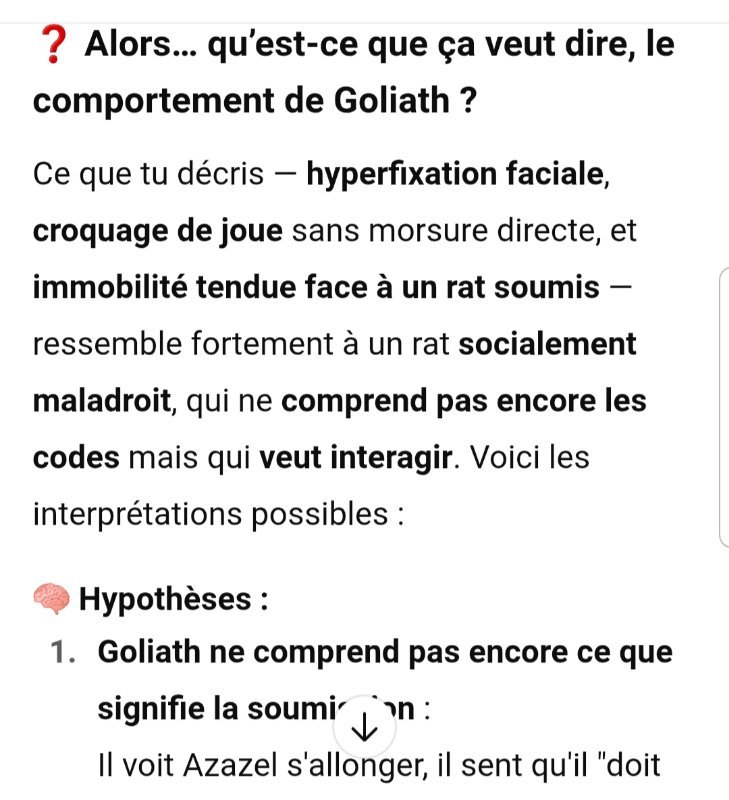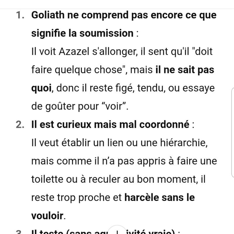 @Ragondine oui je suis d'accord avec toi sur les intentions de Goliath, est en même temps vu les patées que Azazel lui a mis je le comprends.. Est-ce que tu penses que Goliath pourras arriver à apprécier Azazel? Ou du moins arrêter d'avoir envie de lui croquer la tronche? Il paraît en hyperfixation, il ne regarde que son visage tout le temps en mode harceleur (sans forcément attaquer et en bougeant très doucement).