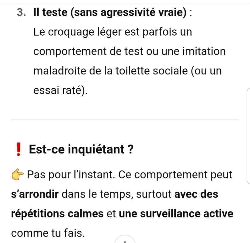Sauf que Goliath ne le fait pas, et reste fixé inlassablement à 1mm du visage d'Azazel et parfois j'ai l'impression qu'il veut lui croquer la joue? Est ce que c'est normal ? Est-ce un début de volonté de toilettage ou d'agression préméditée ? Est-ce que je devrais continuer ma méthode demain ou ajouter quelque chose, comme les enduire de compote ou fromage blanc pour inciter les lechouilles? Merci d'avance pour vos conseils.