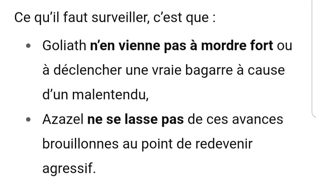 Et concernant les bagarres, est-ce que je dois les séparer dès les premiers cris, premiers coups, retournements, ou le "dos rond et je pivote mon cul en crabe" que fait Azazel?