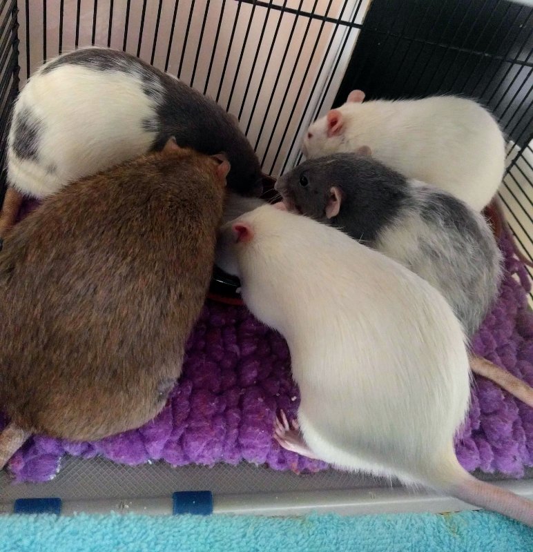Il y a une semaine, suite au décès de deux de mes rates de 2 ans, j'ai intégré deux petites rates réhabilitées de laboratoire : Mira et Arrakis, Hoku les a très vite acceptée et les petites ne l’embêtent quasiment pas :)