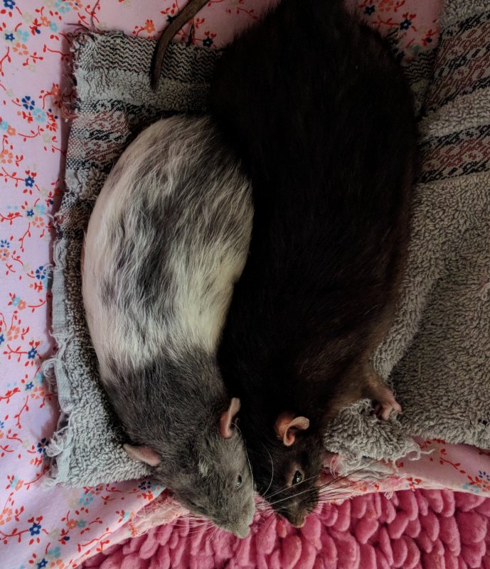 @Ancalimë Pour la queue comme ça, cela ressemble à une "séquelle" de la roue, j'ai lu ça quelque part mais je ne retrouve plus la source. Ca peut rester, comme ça peut disparaître si on ne met plus de roue, c'est juste une habitude persistante pour les rats qui ont utilisé une roue. Ils la replient de cette façon pour qu'elle ne gène pas dans la roue, donc ici, ils ont gardé la posture par habitude je dirais, un peu comme nous après un bras dans le plâtre, on a tendance à garder le bras plié quelques temps.