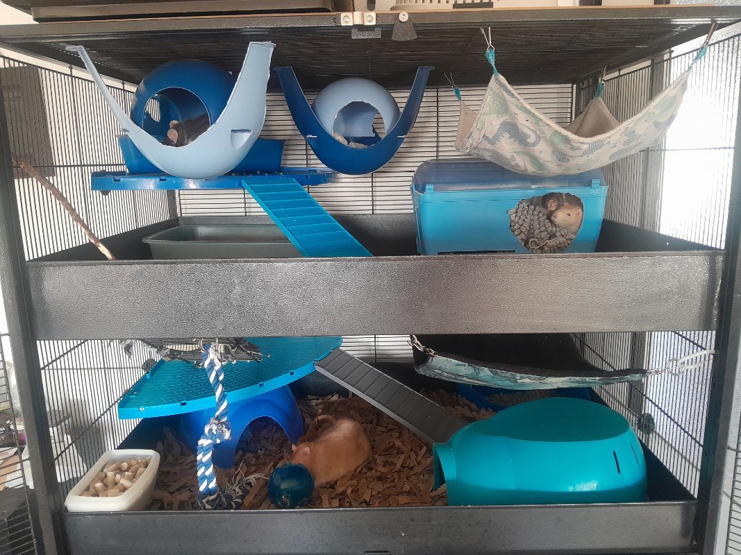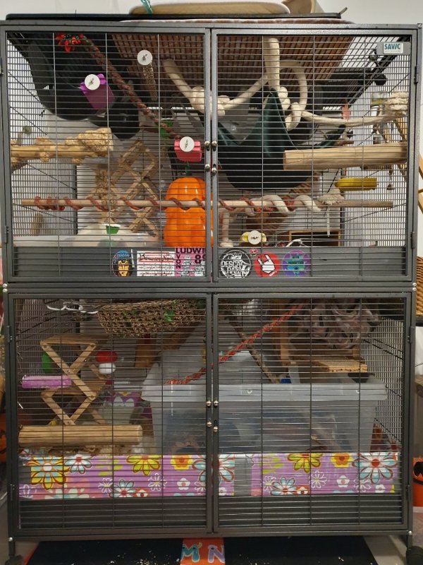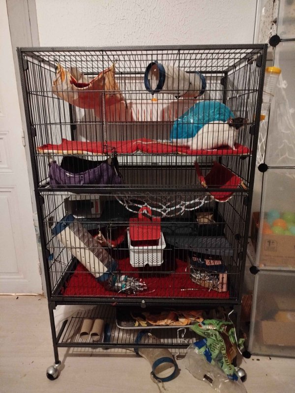 @laeti992 Pour l'étage, on y a pensé quand j'ai constaté que les étages de la Royale XL ne passaient pas (horreur, malheur!) dans la royale 95. Donc on s'est dit que si ça ne passait pas dans un sens, on allait essayer dans l'autre!  (Puis notons qu'ils me servent aussi à bloquer les bacs à litière). Et vu que j'ai toujours eu des rats moyennement doués avec les trucs suspendus, j'aime bien leur mettre beaucoup d'étages pour qu'ils utilisent l'espace. (Puis là, avec ma tripattes, le but était de sécuriser un max pour éviter les chutes, même si au final elle se débrouille bien mieux que certains copines quadrupèdes! :transpire:)