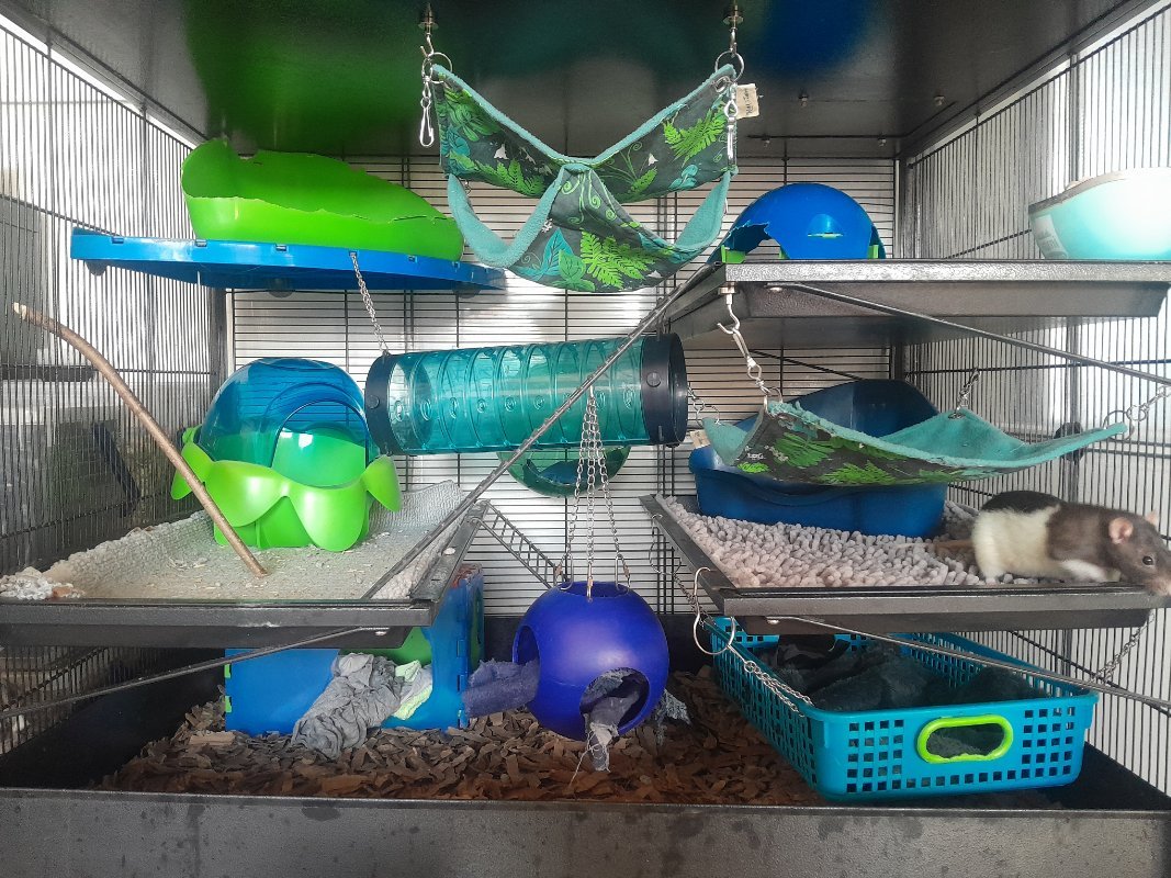 Pour le temps de nettoyage, ce n'est pas pire : un coup de gant avec retrait des crottes tous les jours (car, comme tout le monde le sait, les rats = beaucoup caca, et beaucoup de rats = encore plus de cacas), je change les tissus et hamacs ainsi que la litière des bacs tous les 3 jours environ (généralement, quand ils commencent à sentir, Sadalbari me les sort gentiment des cabanes, je n'ai plus qu'à ramasser!) et une fois par semaine c'est grand nettoyage version très simple : Après avoir pris le bain hebdomadaire, je garde l'eau et je mets tout à tremper (sauf les rats) puis je frotte et je fais sécher, je lance la machine avec les drybeds et les tissus (en hiver il y en a généralement 2/semaine vu qu'ils font beaucoup plus pipi dedans) puis on fait le grand ménage de l'appart dans la foulée vu que le drybed se fait brosser et aspirer et que ça met de la litière et des écorces de graines littéralement partout. Je dois passer 3h hebdomadaires sur le nettoyage de la cage. (Mais c'est vrai que si on rajoute l'étendage et le ramassage de leur petit linge, ça peut monter à plus!)