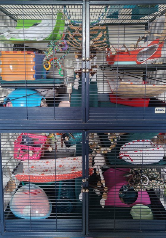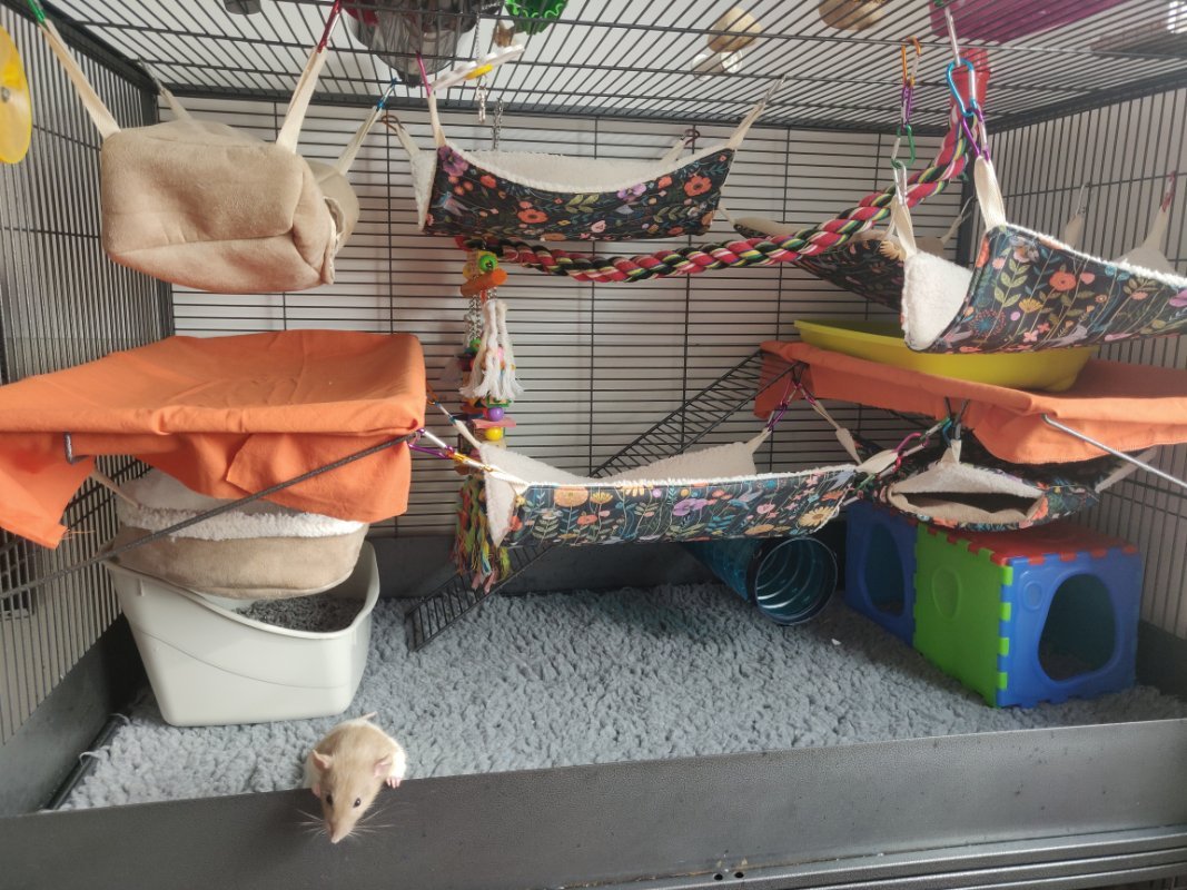 Pour la majorité des accessoires c'est de l'occasion et certains datent même encore de mes débuts il y a 12 ans. Et pour les hamacs, leur durée de vie ici est longue, donc 1 fois par an je couds ou rachete chez des couturières de quoi remplacer ceux qui ont trepassé car avec une troupe de 10 rats en moyenne,  je dois les laver régulièrement.