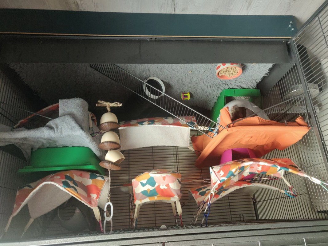 J'ai donc cousu des hamacs assortis à mon autre thématique couleur de cage et modifié l'aménagement en conséquence  :