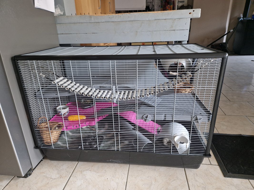 il y a 3 plateformes, 2 sputnik, un tube, une échelle qui fait la longeur de la cage et 2 paniers qui servent de "boîte à fouille" remplis de cartons et tissus où elles se servent pour ajouter dans leur maison. j'ai ajouté une boite avec de la litière et des galets en espérant que ça les incite à être "propres". ce matin j'ai mis les crottes dans la boîte, on verra si elles comprennent...