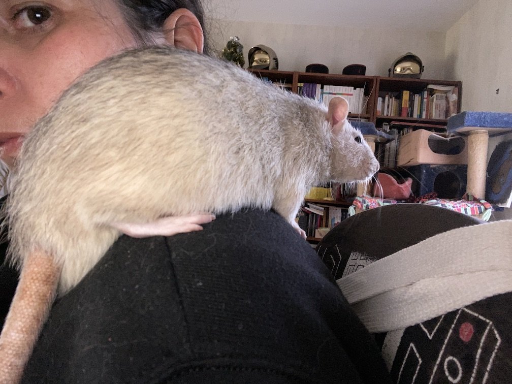 Je voulais voir comment se comportaient mes ratons sur les épaules, en comparaison avec un adulte. L'adulte en question, c'est Flash !