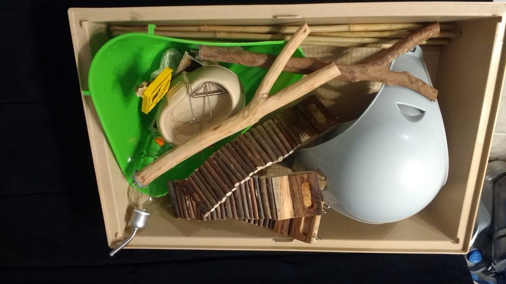 Bonjour, L'heure du ménage de printemps ayant enfin sonné, je voudrais vendre toutes ces petites choses: Maison bleue, comme neuve, presque pas rongée: 4e Tuyau coudé (il y en a 4), pas rongé, sans mousqueton: 2e/pièce Dôme rose, un peu rongé: 7e Bac d'angle bleu marine, comme neuf: 4e Bac d'angle rouge, usure normale: 3e Bac chinchilla comme neuf: 4e Jolies panières parme: 1e/pièce Tuyau jaune et bleu, rongé avec amour: 2e Tuyau accordéon bleu, presque comme neuf: 2e Étage ferplast gris (2 en stock) + 1 échelle. 3 attaches / étage: 3e l'étage, 1e l'échelle Possible d'expédier à vos frais, ou remise en main propres aux alentours de Lille. Tout sera bien évidemment lavé et emballé avec soin et du carton.