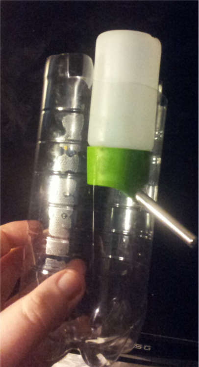 Hello les gens ! Un bail que je ne suis pas passé par ici. J'ai fais quelques courses, dans une idée bien particulière, Qui ne rêve pas de passer son temps avec ses touilles sur le bureau, alors qu'on est entrain de rédiger un article/zoner sur le net/jongler avec des pingouins ? J'ai une hantise lors des sorties... L'eau. Je suis du genre de regarder tous les jours, si la bille fonctionne, si l'eau est bonne, si mes bébés s'hydratent bien... Bref, l'eau, c'est la vie et en sortie, pas de bib' donc hop, on achète un petit bib' de 110ml et on bricolera quelque chose à la maison ! Ça fonctionne tellement bien que j'ai décidé de partager ça avec vous. Matériel : - Une bouteille en plastique (si possible de boisson gazeuse, la texture du plastique s'y prête plus) - Un marqueur - Un cutter - Un bib' de petite taille Démarche : 1) Prise des côtes - Enlevez l'étiquette - Placez le biberon à hauteur finale et marquez sur la bouteille la base de la tige et le haut du bib' 2) Découpes - Reportez la marque du haut du bib' 1cm en dessus, et découpez tout le tour. Non seulement, vous avez votre base, et comme c'est Noël, un entonnoir gratuit ! - Faites une entaille verticalement et horizontalement sur la marque de la base de la tige et recourbez les angles à l'intérieur - Reste la fixation du bib. Faites une marque à 1.5cm du haut de votre nouveau porte bib', au dessus de la sortie de la tige. - Faites une entaille verticale, centrée sur la sortie de la fige du bib', qui fait environ 2/5eme du tour de la bouteille... and voilà ! Le résultat : Reste à remplir le bib', lester avec... ce que vous voulez Pensez que c'est transparent. Ca se décore donc assez facilement pour passer inaperçu ou presque dans votre déco intérieure. Si vous avez des idées d'améliorations, n'hésitez pas !